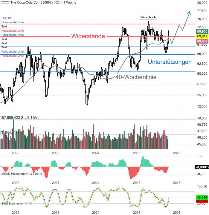 Der Chart zeigt, dass sich die Aktie von Coca-Cola (KO) seit Anfang 2022 in einem übergeordneten Aufwärtstrend befindet, obwohl es zwischenzeitlich zu längeren Korrektur- und Konsolidierungsphasen kam. Der Kurs hat mehrmals versucht, das Rekordhoch zu durchbrechen, was aktuell die wichtigste Hürde darstellt. Die Hauptunterstützungszone, die den langfristigen Trend absichert, liegt bei etwa 65 USD. Solange der Kurs über dieser Zone notiert, ist die langfristige Struktur intakt. Der Slow Stochastic-Indikator befindet sich im Moment im unteren bis mittleren Bereich und zeigt nach einem Rücksetzer wieder aufwärts. Dies deutet darauf hin, dass Raum für eine Aufwärtsbewegung besteht. Der entscheidende Punkt ist der Ausbruch über die Widerstandszone bei 74 USD. Ein Unterschreiten der Hauptunterstützung bei rund 65 USD würde eine deutliche Eintrübung des charttechnischen Bildes bedeuten.