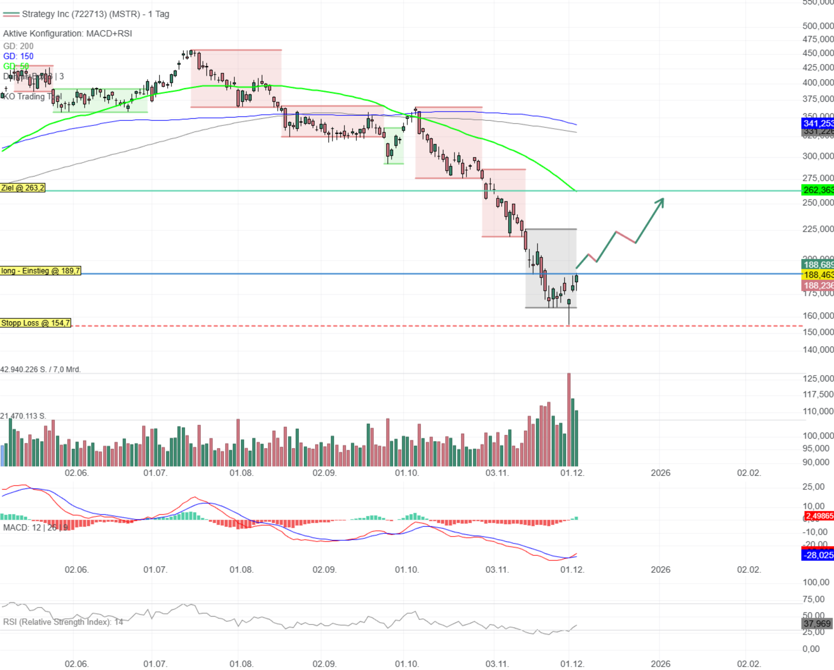 die Aktie von Strategy (WKN: 722713;i) bietet nach einem starken Abverkauf eine Reboundchance. Ja, die Aktie steckt im Abwärtstrend und ein Trade wird bewusst gegen die fallenden gleitenden Durchschnitte eingegangen. Für einen Long sprechen die Kaufsignale im MACD und im RSI, der sich wieder in den neutralen Bereich zurückgekämpft hat. Ein Stop bietet sich unter dem Hammer vom 1. Dezember bei 155 USD an. Der Hammer war nach einem Intraday-Comeback von zwischenzeitlich über -10% unter erhöhtem Volumen entstanden. Ein bullisches Zeichen. Als Ziel kann der GD50 bei rund 260 USD dienen. Das CRV beträgt ca. 2:1. Bleibt die Aktie danach bullisch könnten gar Ziele im Bereich von 330 bis 340 USD angepeilt werden, was das CRV nochmals deutlich verbessert. Trader stellen sich allerdings auf eine stärke Volatilität ein, da es dem Markt offensichtlich schwerfällt, ein faires Preisniveau für die Aktie zu finden.