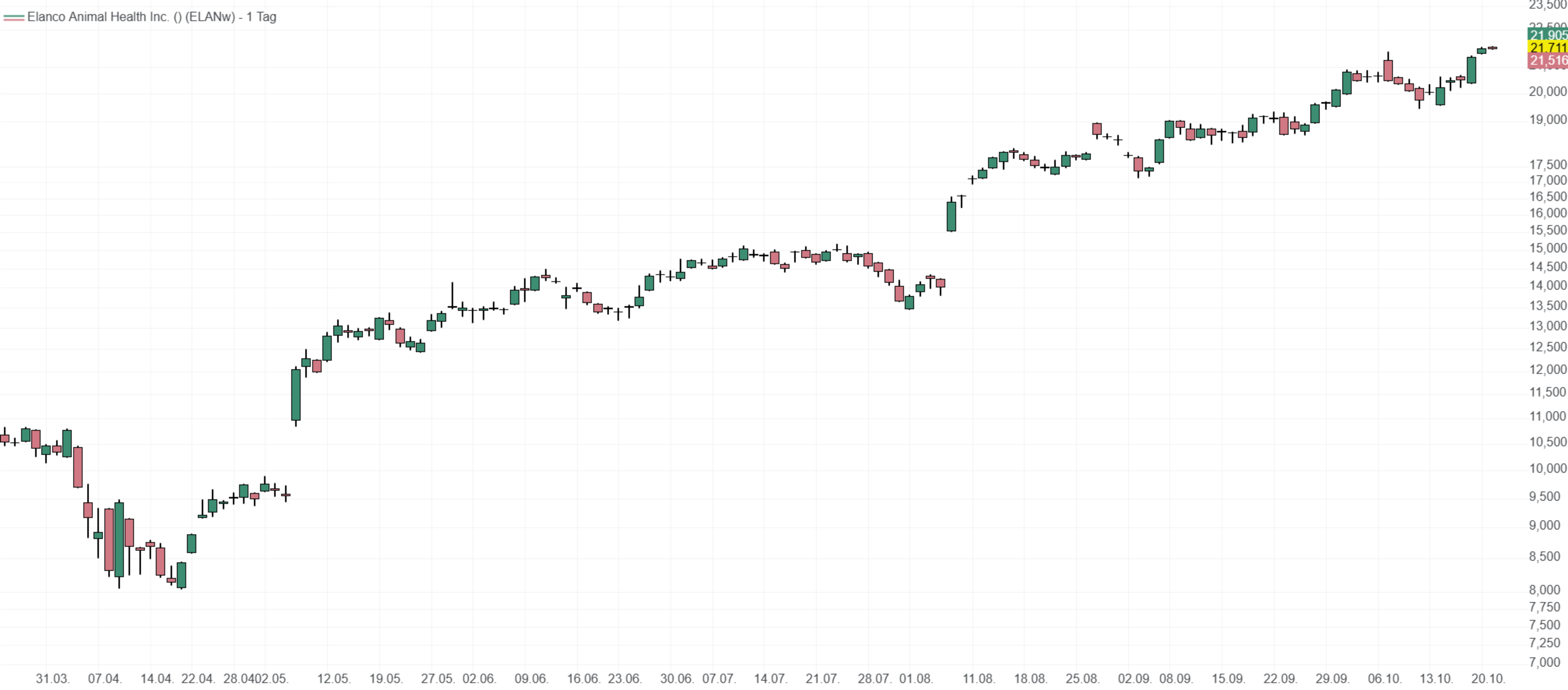 In den letzten 52 Wochen hat die Aktie von Elanco Animal Health eine Rendite von 71 % erzielt. In den vergangenen vier Wochen lag die Rendite bei 13,4 %. Die Aktie markierte das 52-Wochenhoch am 21.10.2025 bei 21,77 USD. Das 52-Wochentief markierte die Aktie am 17.04.2025 bei 8,05 USD. Seitdem konnte sich die Aktie erholen und damit um 170 % seit Tief zulegen.