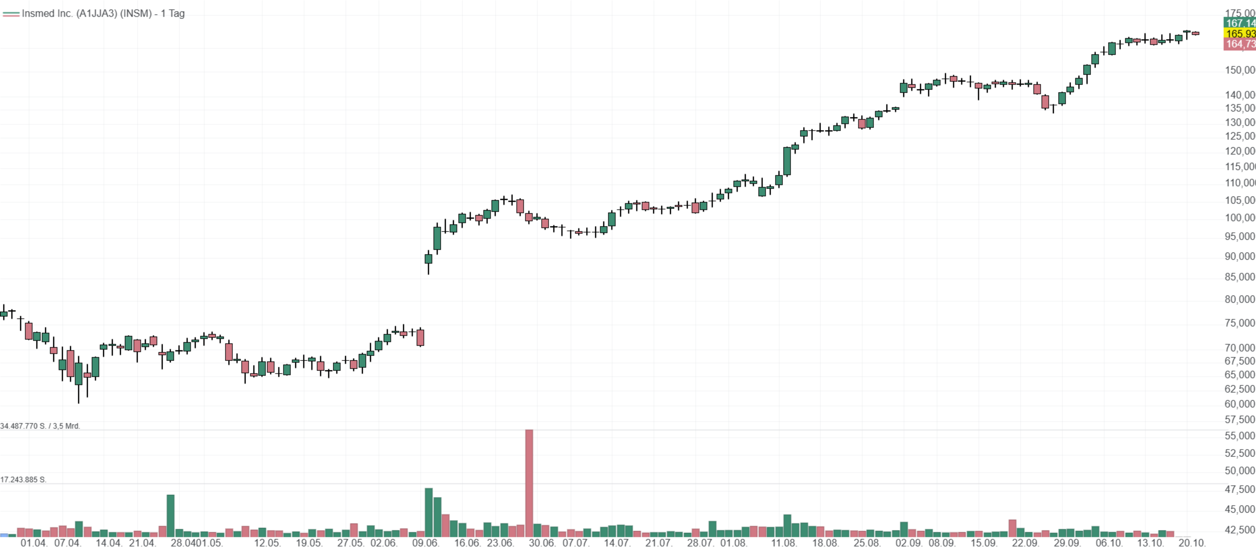 In den letzten 52 Wochen hat die Aktie von Insmed eine Rendite von 125 % erzielt. In den vergangenen vier Wochen lag die Rendite bei 16 %. Die Aktie markierte das 52-Wochenhoch am 20.10.2025 bei 167,86 USD. Das 52-Wochentief markierte die Aktie am 09.04.2025 bei 60,40 USD. Seitdem konnte sich die Aktie stark erholen und damit um 178 % seit Tief zulegen.
