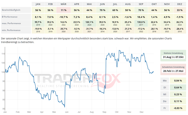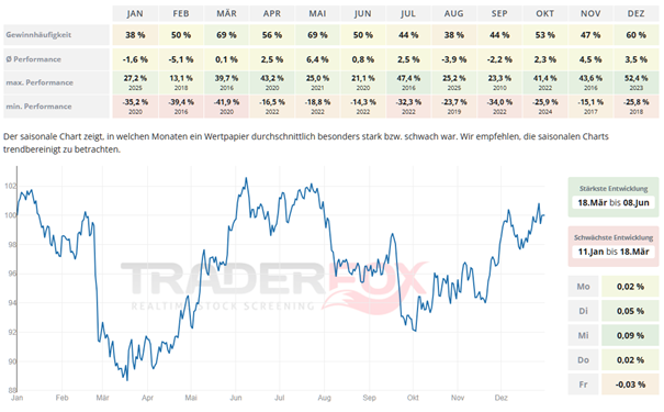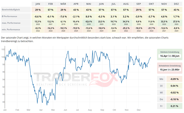 Der Zeitraum mit der stärksten Entwicklung dauert von Mitte April bis Anfang Juni. Der Mai ist dabei mit einer durchschnittlichen Performance von 8 % und einer Gewinnhäufigkeit von 43 % auffällig. Auch der Monat November kann mit einer durchschnittlichen Performance von 4,8 % und einer Gewinnhäufigkeit von 57 % überzeugen.