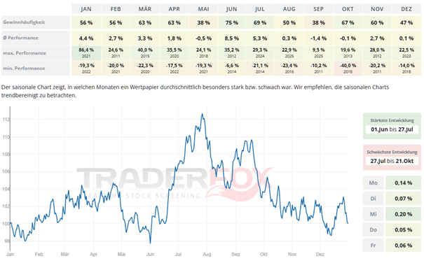 Der Zeitraum mit der stärksten Entwicklung dauert von Anfang Juni bis Ende Juli. Der Juni ist dabei mit einer durchschnittlichen Performance von 8,5 % und einer Gewinnhäufigkeit von 75 % auffällig. Auch der Monat Juli kann mit einer durchschnittlichen Performance von 5,3 % und einer Gewinnhäufigkeit von 69 % überzeugen.