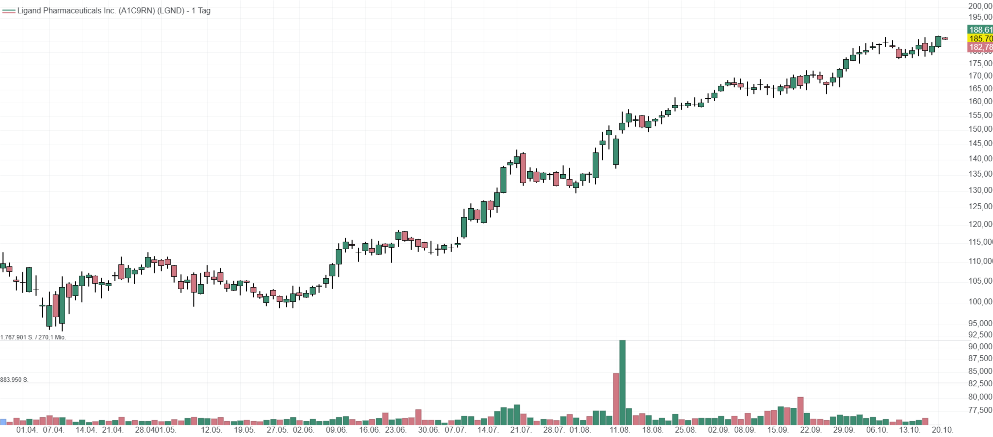 In den letzten 52 Wochen hat die Aktie von Ligand Pharmaceuticals eine Rendite von 74 % erzielt. In den vergangenen vier Wochen lag die Rendite bei 11,2%. Die Aktie markierte das 52-Wochenhoch am 20.10.2025 bei 187,76 USD. Das 52-Wochentief markierte die Aktie am 09.04.2025 bei 93,58 USD. Seitdem konnte sich die Aktie erholen und damit um 98 % seit Tief zulegen.